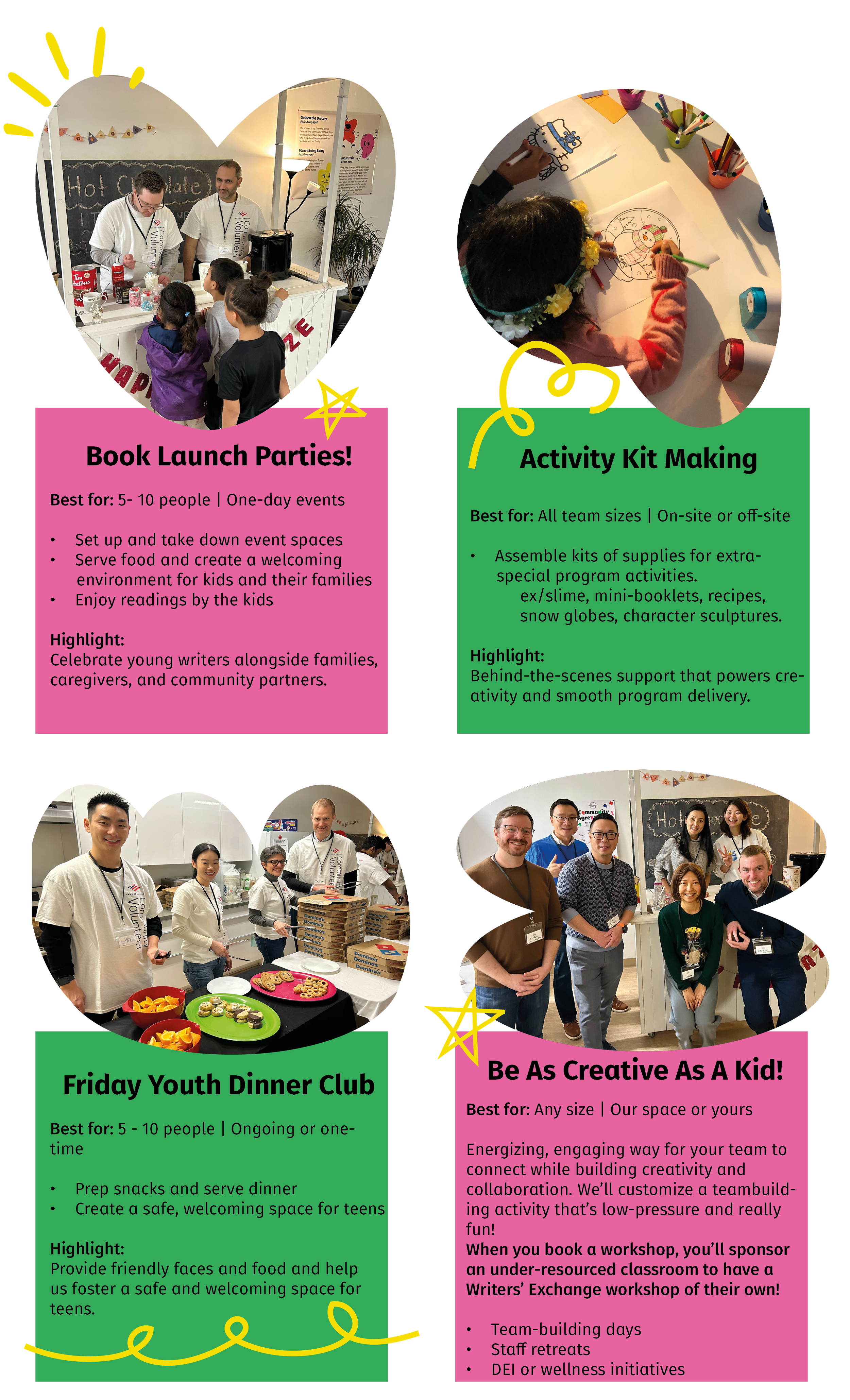 We aim to offer fun, seamless volunteer experiences that connect teams to our programs, build purpose and community, and create meaningful impact for the kids and youth who need it most.